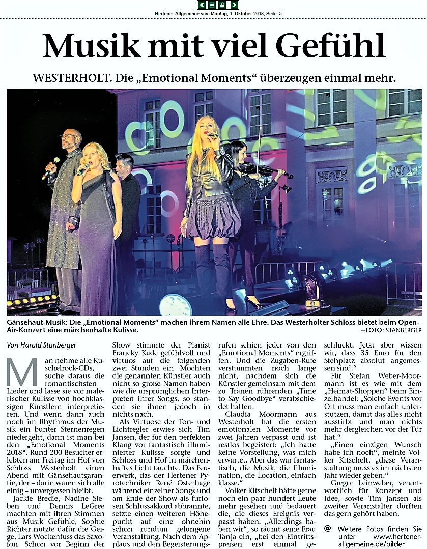 Gänsehaut-Musik: Die „Emotional Moments“ machen ihrem Namen alle Ehre. Das Westerholter Schloss bietet beim Open-Air-Konzert eine märchenhafte Kulisse.
