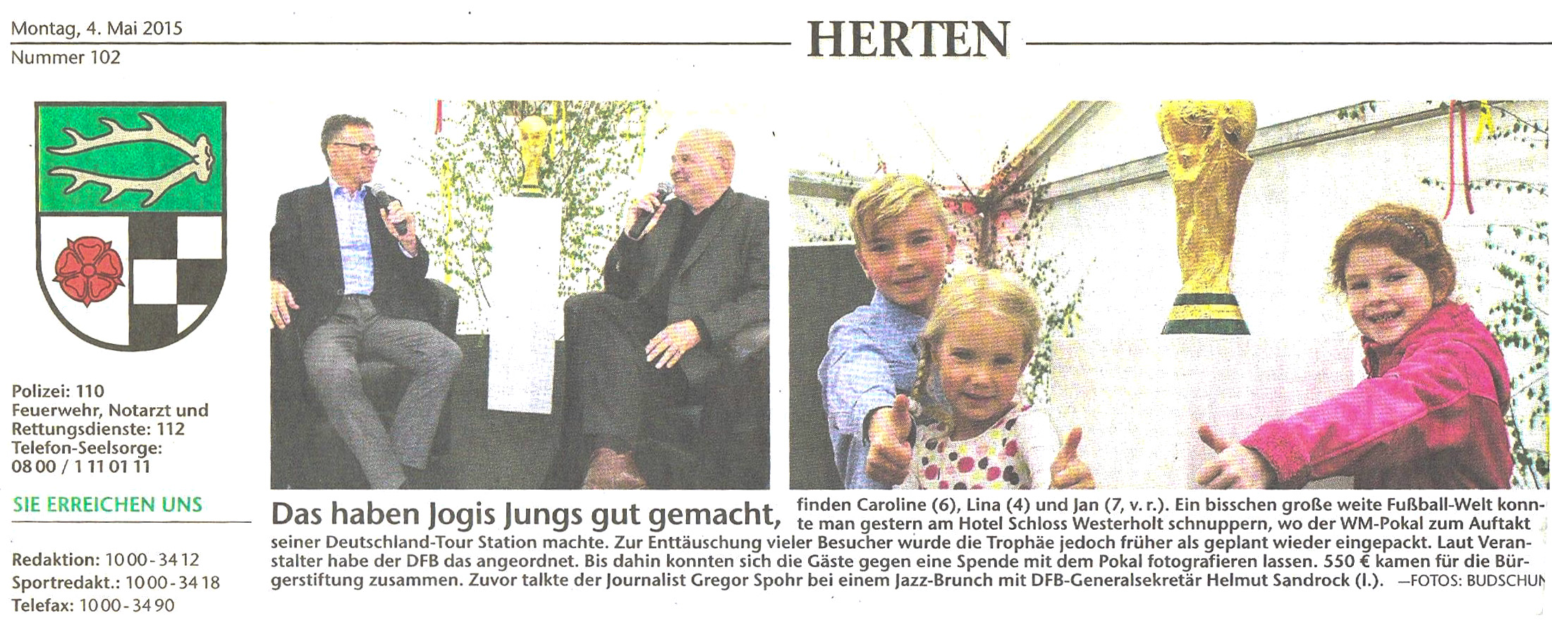 Der echte Fußball Weltpokal auf Schloss Westerholt? Richtig gehört: Gregor Leinweber sorgte dafür, dass der Pokal auf Schloss Westerholt zu besichtigen war – man konnte Fotos machen und sich davon überzeugen: Wir sind tatsächlich Weltmeister!