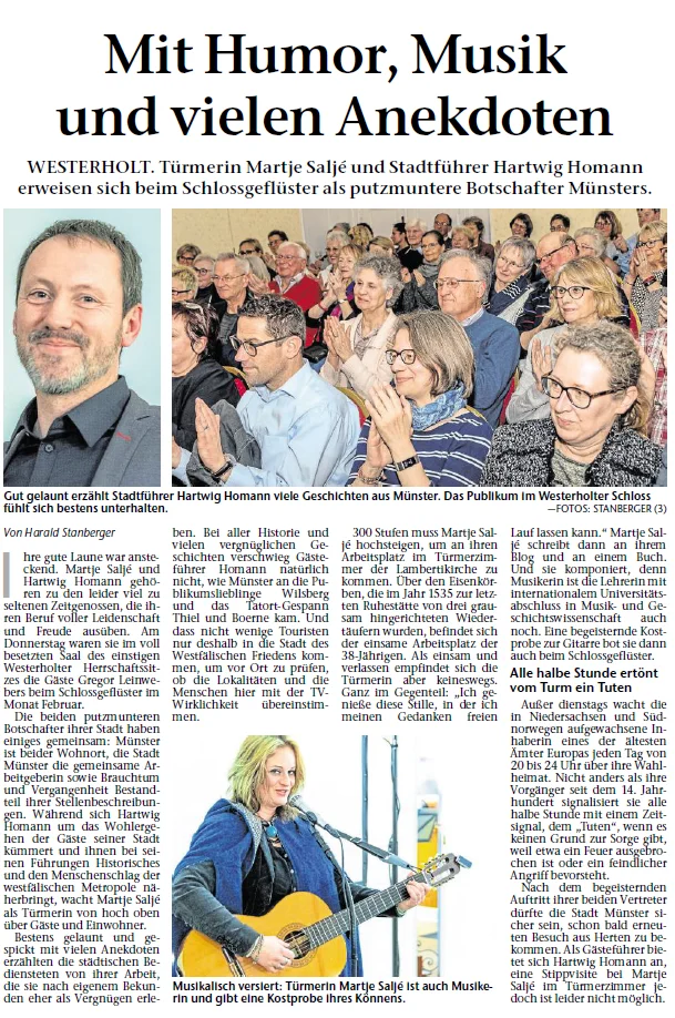 Türmerin Martje Saljé und Stadtführer Hartwig Homann erweisen sich beim Schlossgeflüster als putzmuntere Botschafter Münsters. Gut gelaunt erzählt Stadtführer Hartwig Homann viele Geschichten aus Münster.